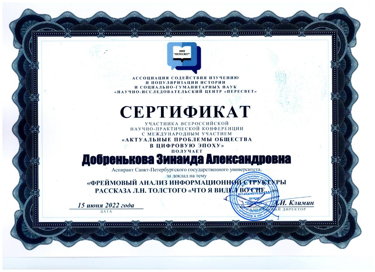 Добренькова З.А. Фреймовый анализ информационной структуры рассказа Л. Н. Толстого «Что я видел во сне» // Актуальные проблемы общества в цифровую эпоху: Сборник научных трудов Всероссийской научно-практической конференции с международным участием «Актуальные проблемы общества в цифровую эпоху», г. Санкт-Петербург, 24 июня 2022 года / Под редакцией А.И. Климина и других; Ассоциация «НИЦ «Пересвет». – СПб.: Ассоциация «НИЦ «Пересвет»; «Фора-принт», 2022. – С. 134-139. [Электронный ресурс]. - Режим доступа: https://s.siteapi.org/db33f211b111f03/docs/9mjv1tzcoj0owggsgkcggssgkk4gcc