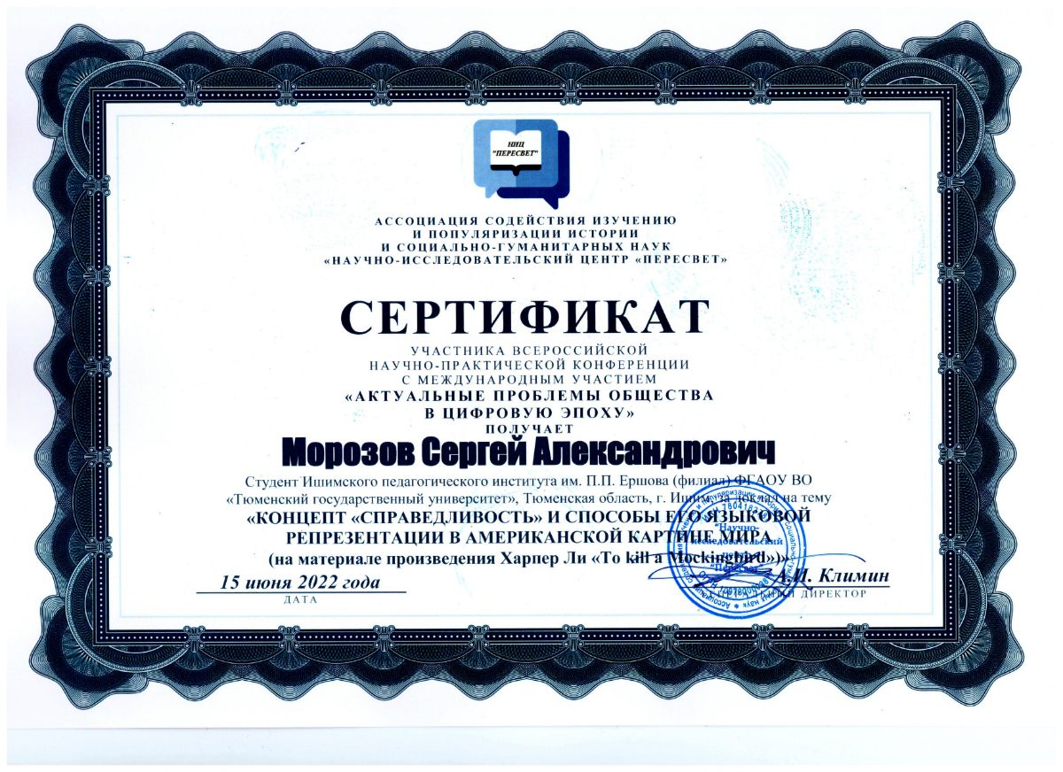 Морозов С.А. Концепт «Справедливость» и способы его языковой репрезентации в американской картине мира (на материале романа Харпер Ли «Убить пересмешника») // Актуальные проблемы общества в цифровую эпоху: Сборник научных трудов Всероссийской научно-практической конференции с международным участием «Актуальные проблемы общества в цифровую эпоху», г. Санкт-Петербург, 24 июня 2022 года / Под редакцией А.И. Климина и других; Ассоциация «НИЦ «Пересвет». – СПб.: Ассоциация «НИЦ «Пересвет»; «Фора-принт», 2022. – С. 140-144. [Электронный ресурс]. - Режим доступа: https://s.siteapi.org/db33f211b111f03/docs/ov635uat66o8sk4cg8gg4csw0gwc44