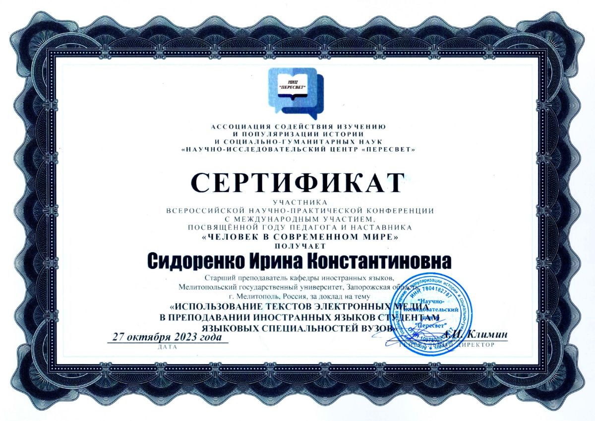 Сидоренко Ирина Константиновна (Sidorenko Irina Konstantinovna) – старший преподаватель кафедры иностранных языков, Мелитопольский государственный университет, Запорожская область, г. Мелитополь, Россия.