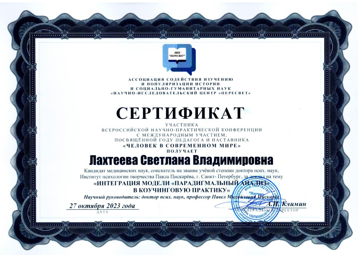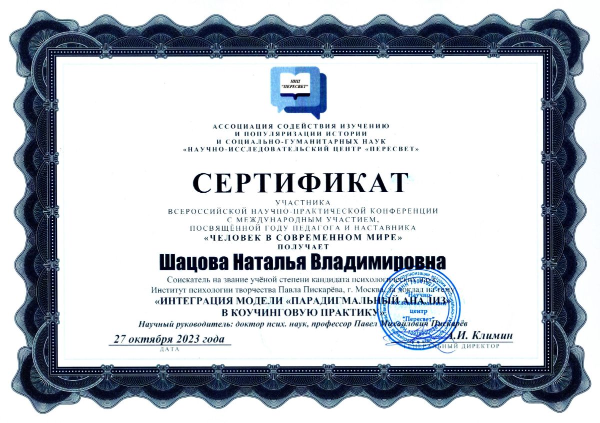 Шацова Н.В., Лахтеева С.В., Логвинова Ю.В. Интеграция модели «Парадигмальный анализ» в коучинговую практику // Человек в современном мире: Сборник научных трудов Всероссийской научно-практической конференции с международным участием, посвящённой Году педагога и наставника «Человек в современном мире», г. Санкт-Петербург, 27 октября 2023 года / под редакцией А.И. Климина и других; Ассоциация «НИЦ «Пересвет». – СПб.: Ассоциация «НИЦ «Пересвет», 2023. – С. 76-80. [Электронный ресурс]. - Режим доступа: https://s.siteapi.org/db33f211b111f03/docs/p56gwznpnr40w044kg4okgkwg8o04w