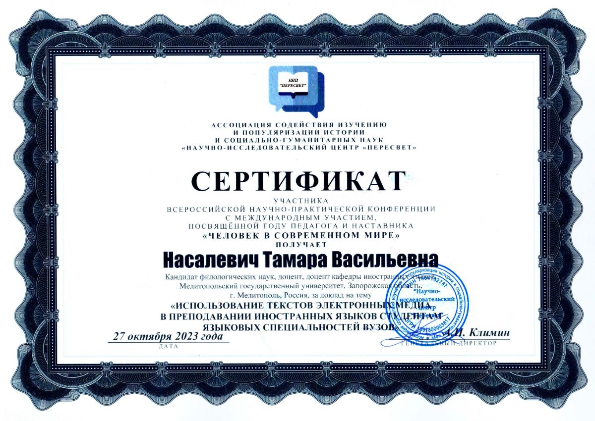 Насалевич Т.В., Тарасенко Т.В., Сидоренко И.К. Использование текстов электронных медиа в преподавании иностранных языков студентам языковых специальностей вузов // Человек в современном мире: Сборник научных трудов Всероссийской научно-практической конференции с международным участием, посвящённой Году педагога и наставника «Человек в современном мире», г. Санкт-Петербург, 27 октября 2023 года / под редакцией А.И. Климина и других; Ассоциация «НИЦ «Пересвет». – СПб.: Ассоциация «НИЦ «Пересвет», 2023. – С. 54-58. [Электронный ресурс]. - Режим доступа: https://s.siteapi.org/db33f211b111f03/docs/hhc5xgazpr4g004so08s0c80so000w