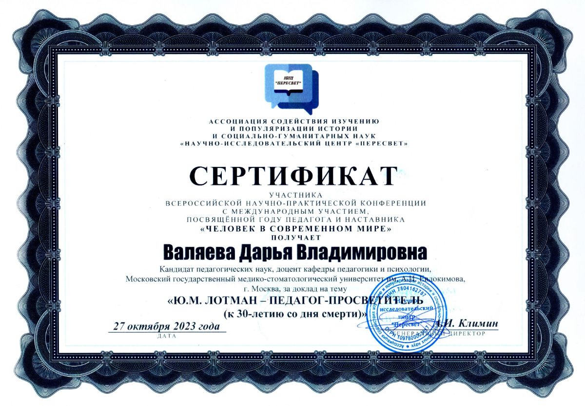 Валяева Д.В. Ю.М. Лотман – педагог-просветитель (к 30-летию со дня смерти) // Человек в современном мире: Сборник научных трудов Всероссийской научно-практической конференции с международным участием, посвящённой Году педагога и наставника «Человек в современном мире», г. Санкт-Петербург, 27 октября 2023 года / под редакцией А.И. Климина и других; Ассоциация «НИЦ «Пересвет». – СПб.: Ассоциация «НИЦ «Пересвет», 2023. – С. 8-17. [Электронный ресурс]. - Режим доступа: https://s.siteapi.org/db33f211b111f03/docs/krl2xwmybxssokokwgg88440kk8s48