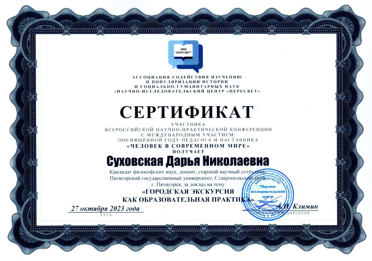 Суховская Д.Н. Городская экскурсия в контексте социокультурной и образовательной практик // Человек в современном мире: Сборник научных трудов Всероссийской научно-практической конференции с международным участием, посвящённой Году педагога и наставника «Человек в современном мире», г. Санкт-Петербург, 27 октября 2023 года / под редакцией А.И. Климина и других; Ассоциация «НИЦ «Пересвет». – СПб.: Ассоциация «НИЦ «Пересвет», 2023. – С. 50-53. [Электронный ресурс]. - Режим доступа: https://s.siteapi.org/db33f211b111f03/docs/iqdwcno8a0owoc8so88sgo0wocwocc