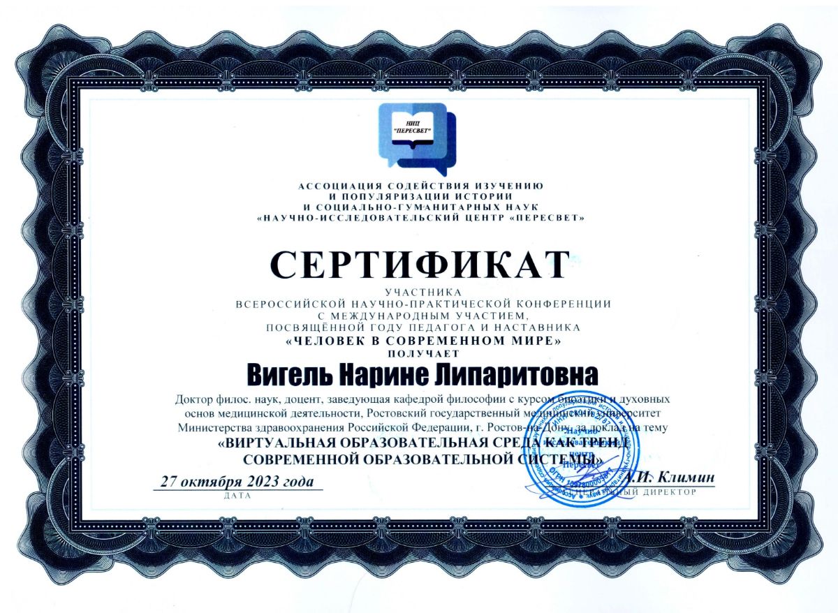 Вигель Нарине Липаритовна (Vigel Narine Liparitovna) – доктор философских наук, член-корреспондент Российской академии естествознания, доцент, заведующая кафедрой философии с курсом биоэтики и духовных основ медицинской деятельности, Ростовский государственный медицинский университет Министерства здравоохранения Российской Федерации, г. Ростов-на-Дону, Россия.