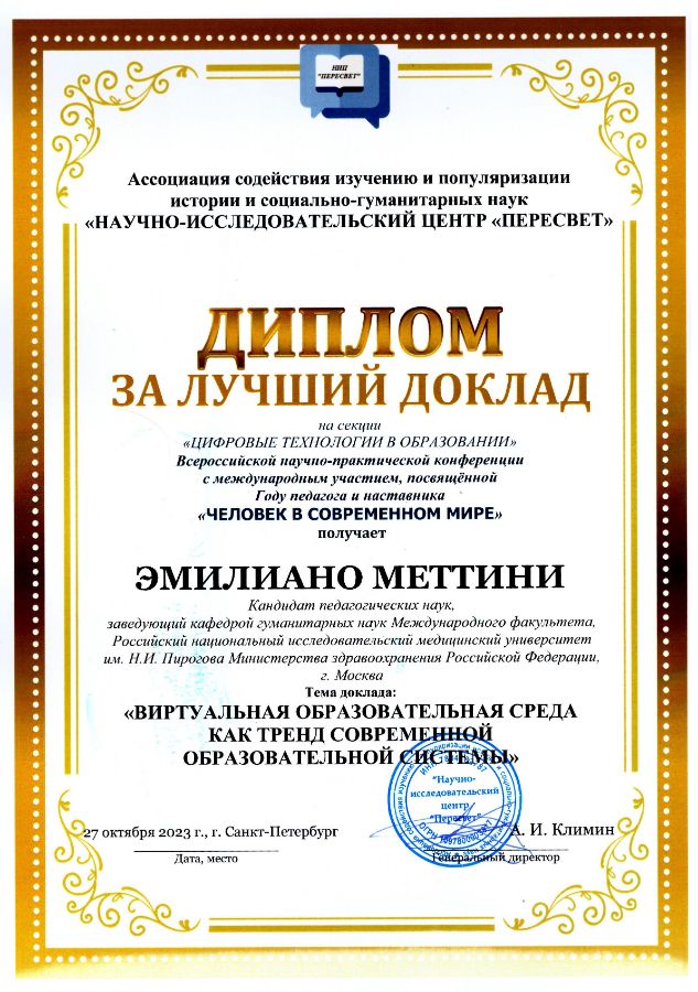 Меттини Эмилиано (Mettini Emiliano) – кандидат педагогических наук, заведующий кафедрой гуманитарных наук Международного факультета, Российский национальный исследовательский медицинский университет имени Н.И. Пирогова Министерства здравоохранения Российской Федерации, г. Москва, Россия.