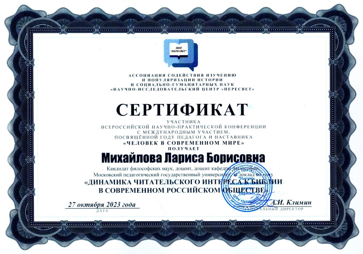 Михайлова Л.Б., Михайлов А.Н. Динамика читательского интереса к Библии в современном российском обществе // Человек в современном мире: Сборник научных трудов Всероссийской научно-практической конференции с международным участием, посвящённой Году педагога и наставника «Человек в современном мире», г. Санкт-Петербург, 27 октября 2023 года / под редакцией А.И. Климина и других; Ассоциация «НИЦ «Пересвет». – СПб.: Ассоциация «НИЦ «Пересвет», 2023. – С. 71-75. [Электронный ресурс]. - Режим доступа: https://s.siteapi.org/db33f211b111f03/docs/ej3p1vr6cnsccgwgsok0ok4o0gcgw8