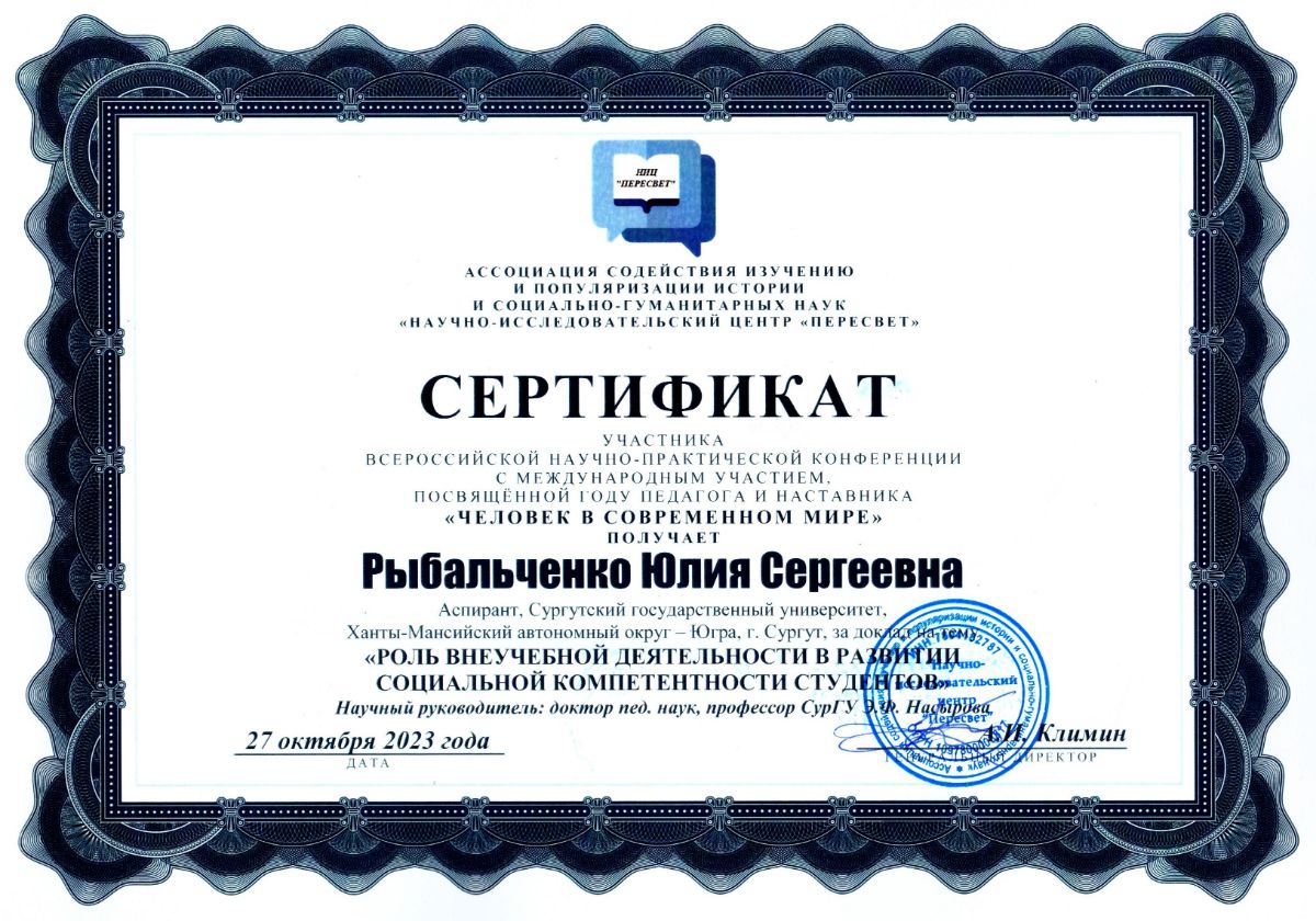 Рыбальченко Ю.С. Роль внеучебной деятельности в развитии социальной компетентности студентов // Человек в современном мире: Сборник научных трудов Всероссийской научно-практической конференции с международным участием, посвящённой Году педагога и наставника «Человек в современном мире», г. Санкт-Петербург, 27 октября 2023 года / под редакцией А.И. Климина и других; Ассоциация «НИЦ «Пересвет». – СПб.: Ассоциация «НИЦ «Пересвет», 2023. – С. 38-43. [Электронный ресурс]. - Режим доступа: https://s.siteapi.org/db33f211b111f03/docs/bqwto3jap1k44sscs40cgwc44swg0o