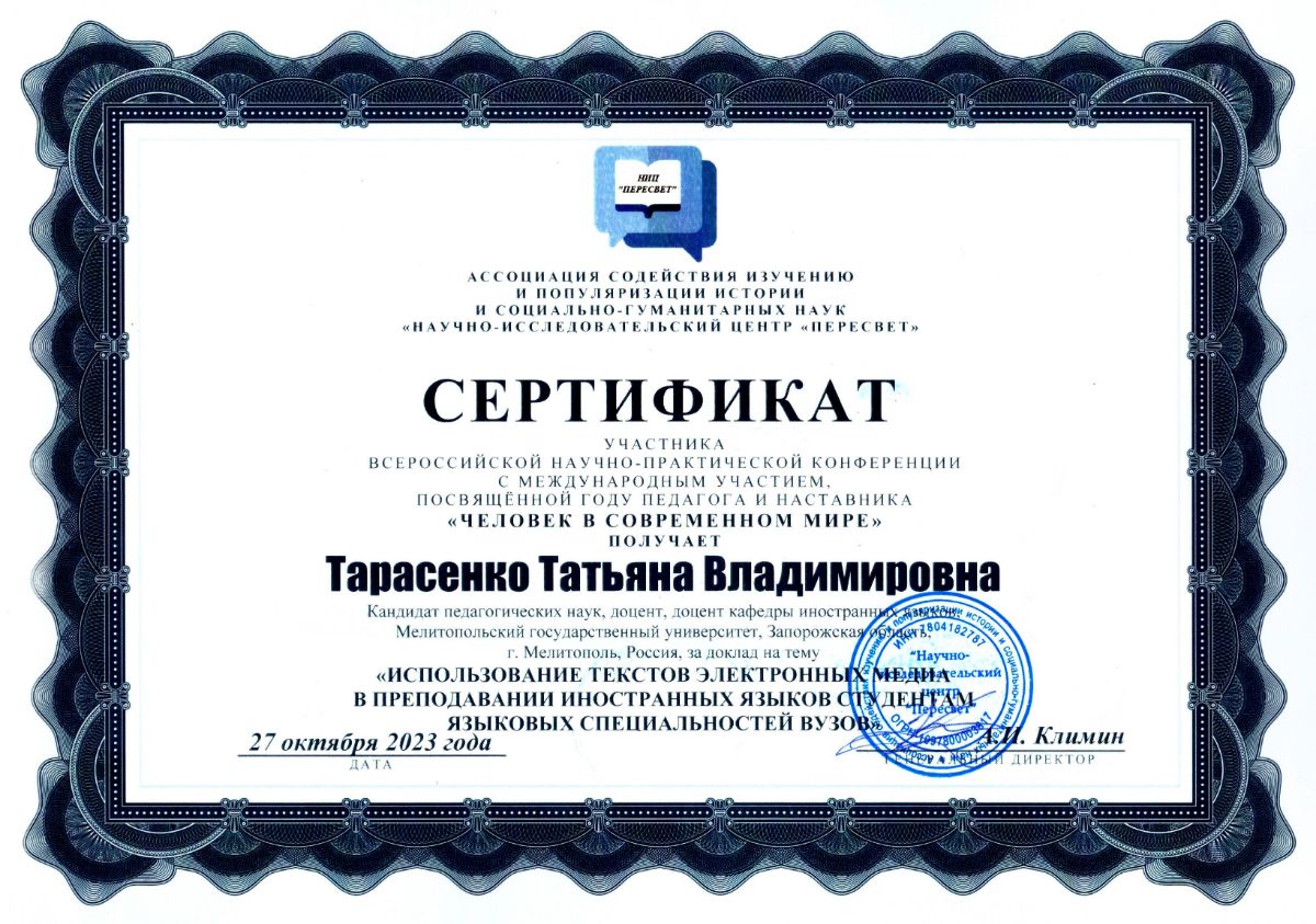Тарасенко Татьяна Владимировна (Tarasenko Tatiana Vladimirovna) – кандидат педагогических наук, доцент, доцент кафедры иностранных языков, Мелитопольский государственный университет, Запорожская область, г. Мелитополь, Россия.